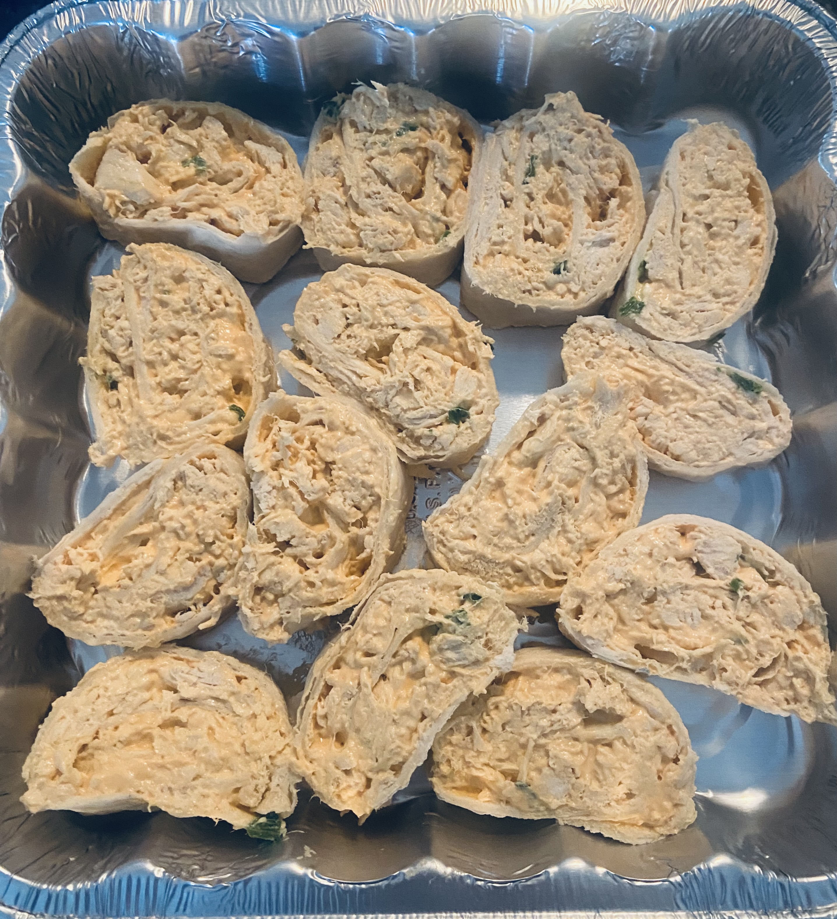 The next step is very important. In the past, I have tried to make pinwheel sandwiches and couldn’t understand why they would fall apart when I start to slice the tortilla…you need to wrap the tortilla/chicken buffalo mixture in either plastic wrap or aluminum foil and place in the refrigerator for at least 30 minutes. If you are rushed for time, I have placed it in the refrigerator for 15-20 minutes and had the same results.