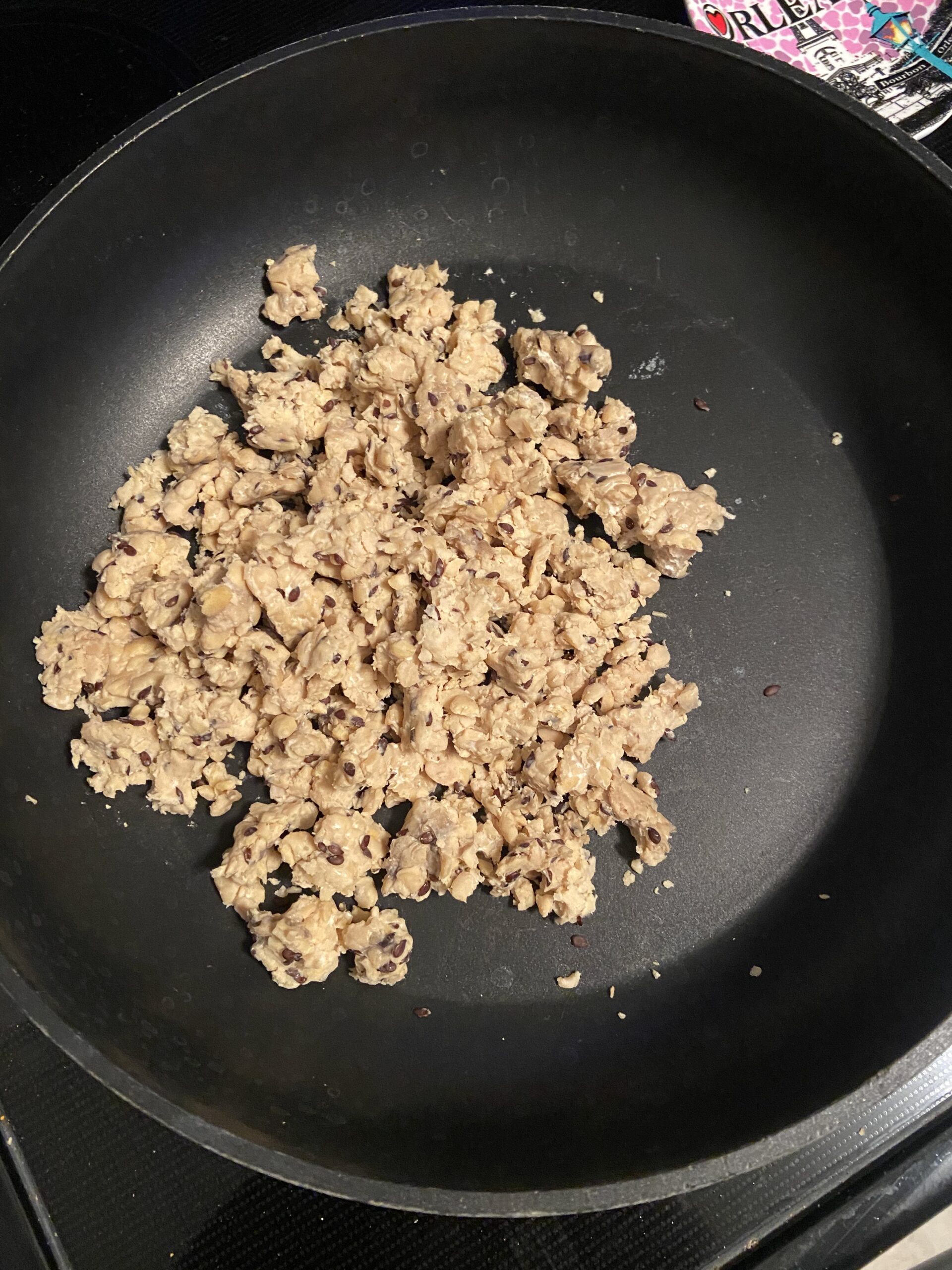 - Remove tempeh from package and crumble using your hands into a warming frying pan