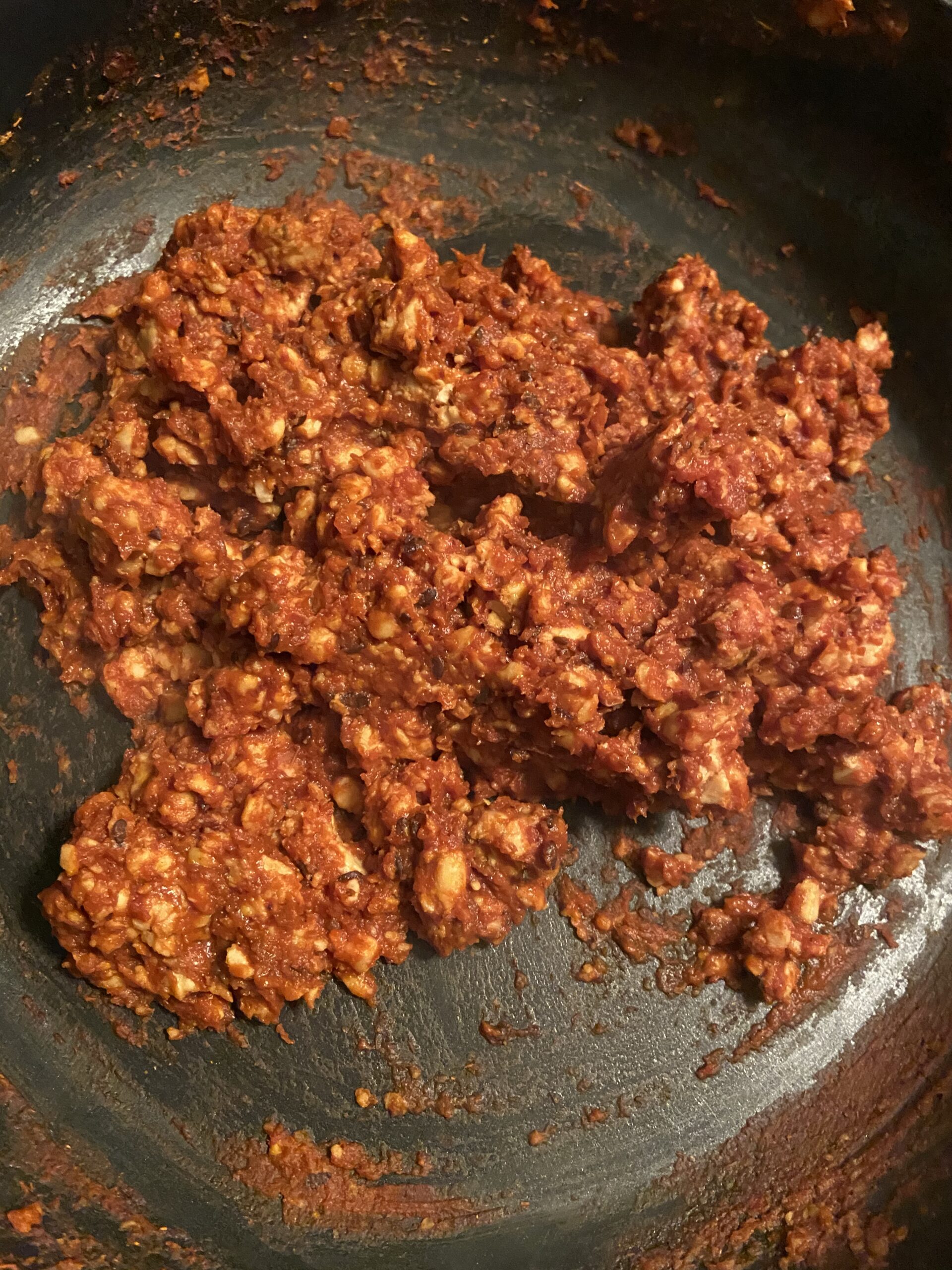 - Add 6 oz of tomato paste to tempeh. Save can.