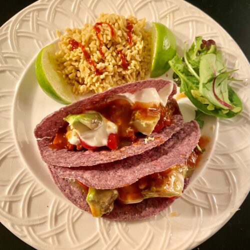 The macros included below include RightRice for a side or to be added into the tacos themselves. They also include 1/2 an avocado for toppings: