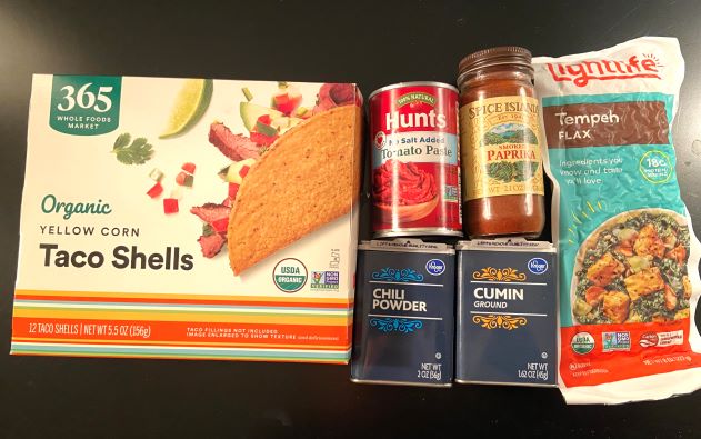 Tempeh is fermented soy beans, so once you remove the packaging, you can just crumble up using your hands into a pan. It already starts to resemble ground meat. After that, it’s about the spices and additions to make the tempeh taste like taco meat.