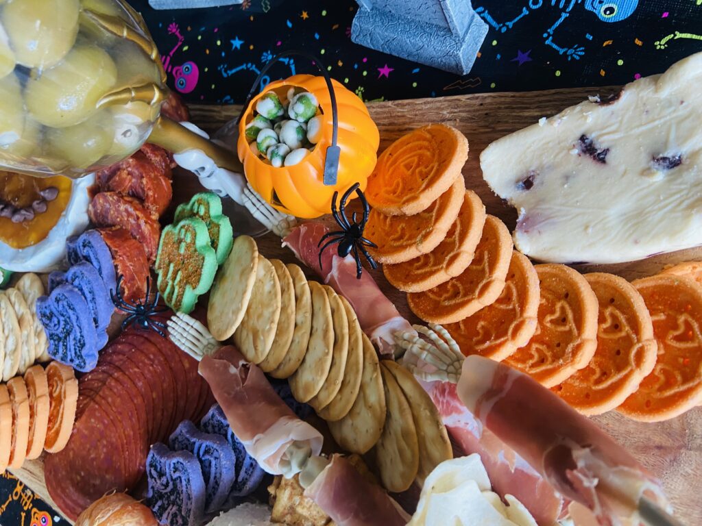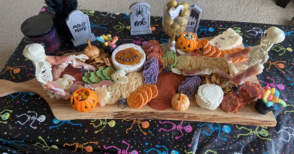 After arranging everything I added some plastic spiders that I had in my decorations and voila! Charcuterie boards are sooo fun to make and you cannot go wrong. I could spend hours moving things into different positions to see what looks best!