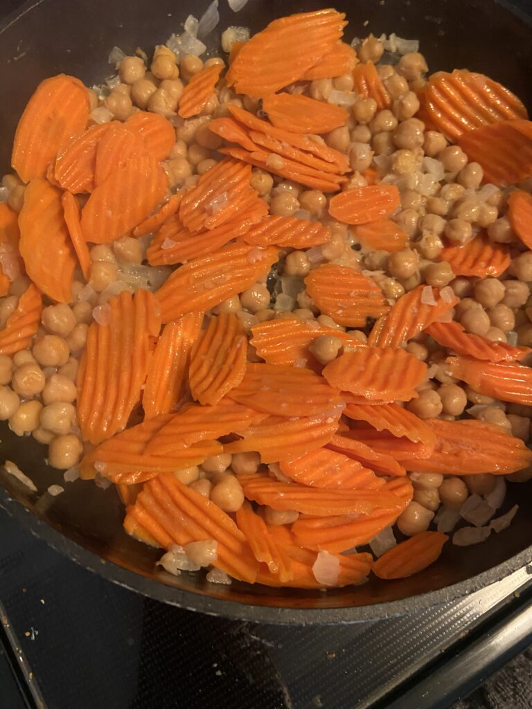 After the onions start browning, throw in the carrots and the chickpeas and let simmer for about 3-4 minutes. I then added in that tikka masala sauce I found and like simmer for another 8 minutes to get everything nice and marinated together.