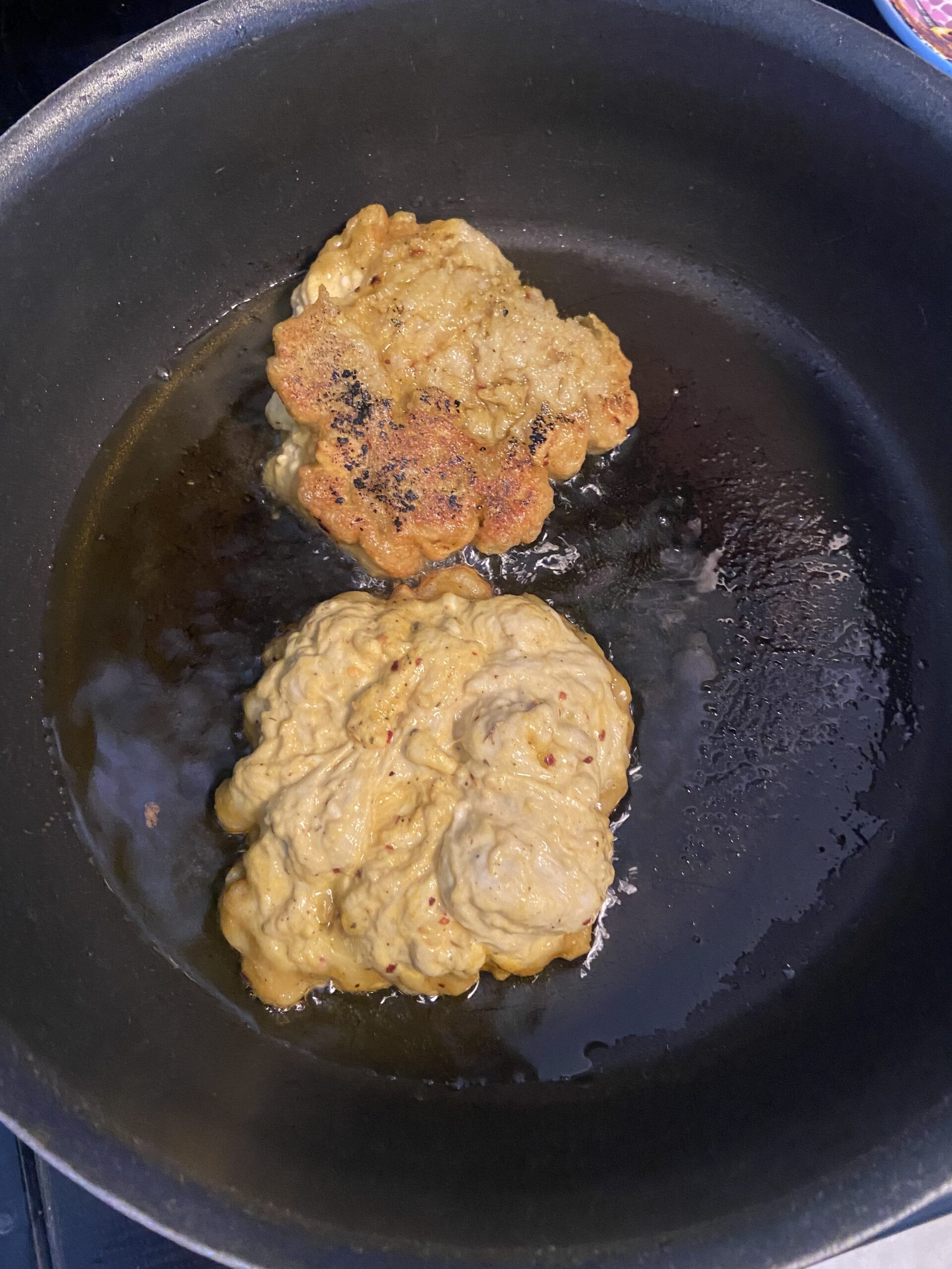 Next, I poured oil into a pan and let each side simmer for 5 minutes. This made it golden brown and actually made me excited! Maybe my white water disaster wouldn’t ruin the whole thing.