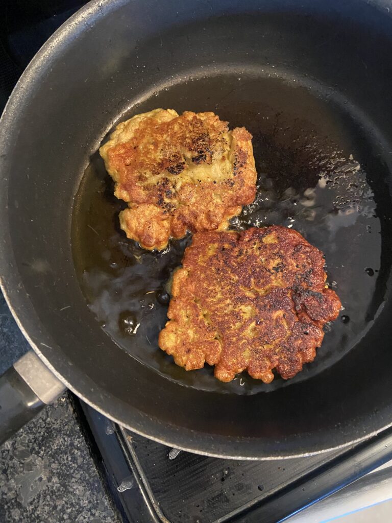 I then filled the pan about halfway up the “knot patties” with broth, turned the stovetop down, and covered for 1 hour. I flipped them over at the 30 minute mark.